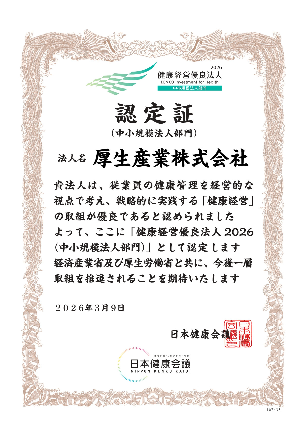 厚生産業株式会社は、経済産業省が認定する「健康経営優良法人認定制度」の中小規模法人部門の認定をいただきました。