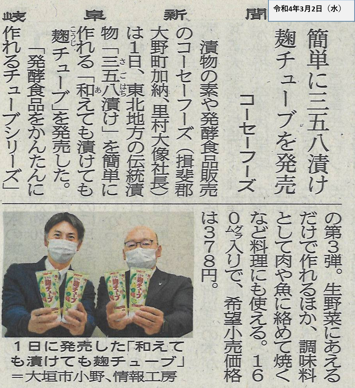 岐阜新聞で新商品、「和えても漬けても麹チューブ」が商会されました。